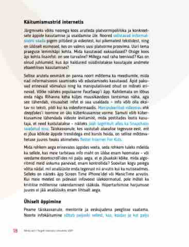 Sellise arutelu eesmärk on panna noort mõtlema ka meediumile, mida nad informatsiooni saamiseks või edastamiseks kasutavad. Äpid paku- vad erinevaid võimalusi ning ka manipulatiivsed ohud on mõneti eri- nevad. Võtke näiteks populaarne FaceSwap’i äpp. Kahtlemata on lõbus enda nägu Rihanna keha küljes muusikavideos tantsimas näha, aga see tähendab, visuaalset infot ei saa usaldada – info võib olla eksi- tav nii teksti, pildi kui ka videoformaadis. Manipuleeritud videosisu ehk deepfakes’i loomine on üks küberkiusamise vorme. Samuti võib küber- kiusamine tähendada videote levitamist, mida postitades lootis kasu- taja, et need kustutatakse – näiteks jääb tegelikult alles ka Snapchatis saadetud sisu. Täiskasvanule, kes vastutab alaealise tegevuse eest, ent ei jõua kõikide äppide trendidega end kursis hoida, on sellise mõtteva- hetuse juures heaks abimeheks Better Internet For Kids.