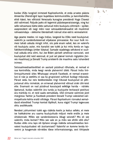 Aga peame meeles: nii nagu Indias, langesid ka USAs need kuulujutud, valeinfo ja vandenõuteooriad viljakasse pinnasesse. Kui suur hulk ini- mesi tahab uskuda mingit infot, siis pole enam vahet, kes on valeinfo või kuulujutu autor, mis kanalist see tuleb ja kui mitu korda on lugu faktikontrollidega ümber lükatud. Samade vaadetega seltskond ei suut- nud uskuda oma silmi, kui Joe Biden päriselt ametisse vannutati, sest kuulujutud olid neid veennud, et just sel päeval toimub riigipööre (ter- ves maailmas) ja Donald Trump arreteerib üle maailma sadu tuhandeid inimesi.
