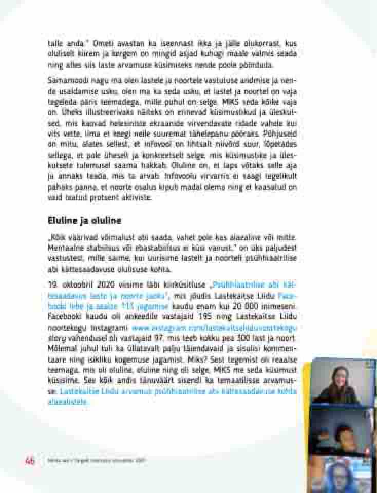 19. oktoobril 2020 viisime läbi kiirküsitluse „Psühhiaatrilise abi kät- tesaadavus laste ja noorte jaoks“, mis jõudis Lastekaitse Liidu Face- booki lehe ja sealse 113 jagamise kaudu enam kui 20 000 inimeseni. Facebooki kaudu oli ankeedile vastajaid 195 ning Lastekaitse Liidu noortekogu Instagrami www.instagram.com/lastekaitseliidunoortekogu story vahendusel oli vastajaid 97, mis teeb kokku pea 300 last ja noort. Mõlemal juhul tuli ka üllatavalt palju täiendavaid ja sisulisi kommen- taare ning isikliku kogemuse jagamist. Miks? Sest tegemist oli reaalse teemaga, mis oli oluline, eluline ning oli selge, MIKS me seda küsimust küsisime. See kõik andis tänuväärt sisendi ka temaatilisse arvamus- se: Lastekaitse Liidu arvamus psühhiaatrilise abi kättesaadavuse kohta alaealistele.