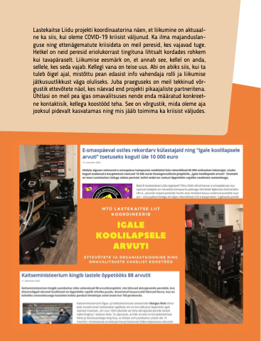 Lastekaitse Liidu projekti koordinaatorina näen, et liikumine on aktuaal- ne ka siis, kui oleme COVID-19 kriisist väljunud. Ka ilma majanduslan- guse ning ettenägematute kriisideta on meil peresid, kes vajavad tuge. Hetkel on neid peresid eriolukorrast tingituna lihtsalt kordades rohkem kui tavapäraselt. Liikumise eesmärk on, et annab see, kellel on anda, sellele, kes seda vajab. Kellegi vana on teise uus. Abi on abiks siis, kui ta tuleb õigel ajal, mistõttu pean edasist info vahendaja rolli ja liikumise jätkusuutlikkust väga oluliseks. Juba praeguseks on meil tekkinud võr- gustik ettevõtete näol, kes näevad end projekti pikaajaliste partneritena. Ühtlasi on meil pea igas omavalitsuses nende enda määratud konkreet- ne kontaktisik, kellega koostööd teha. See on võrgustik, mida oleme aja jooksul pidevalt kasvatamas ning mis jääb toimima ka kriisist väljudes.