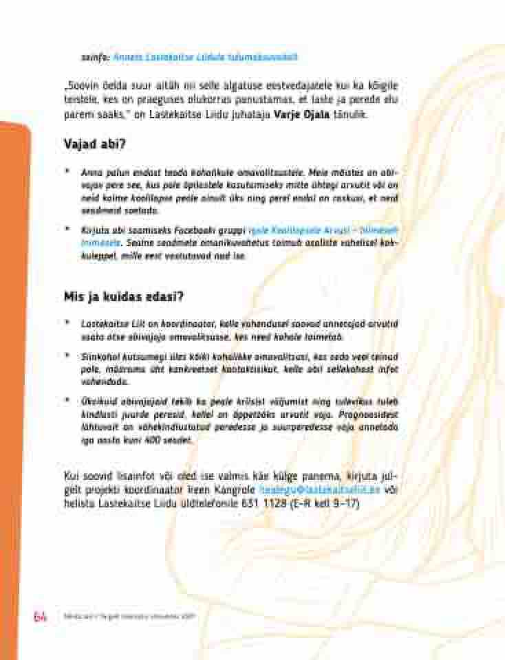 Kui soovid lisainfot või oled ise valmis käe külge panema, kirjuta jul- gelt projekti koordinaator Ireen Kangrole heategu@lastekaitseliit.ee või helista Lastekaitse Liidu üldtelefonile 631 1128 (E–R kell 9–17)