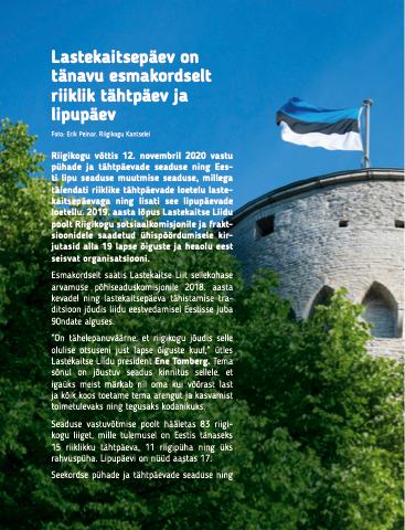 Riigikogu võttis 12. novembril 2020 vastu pühade ja tähtpäevade seaduse ning Ees- ti lipu seaduse muutmise seaduse, millega täiendati riiklike tähtpäevade loetelu laste- kaitsepäevaga ning lisati see lipupäevade loetellu. 2019. aasta lõpus Lastekaitse Liidu poolt Riigikogu sotsiaalkomisjonile ja frakt- sioonidele saadetud ühispöördumisele kir- jutasid alla 19 lapse õiguste ja heaolu eest seisvat organisatsiooni.