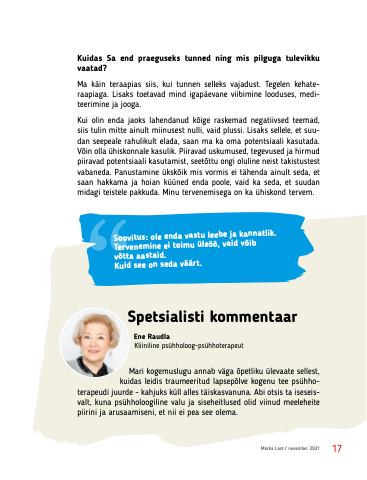 Mari kogemuslugu annab väga õpetliku ülevaate sellest, kuidas leidis traumeeritud lapsepõlve kogenu tee psühho- terapeudi juurde - kahjuks küll alles täiskasvanuna. Abi otsis ta iseseis- valt, kuna psühholoogiline valu ja siseheitlused olid viinud meeleheite