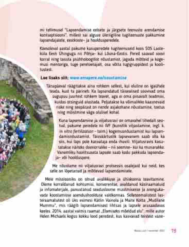 Meie missiooniks on olnud avalikkuse ja ühiskonna teavitamine. Oleme korraldanud kohtumisi, konverentse, avaldanud käsiraamatuid ja infomaterjale, panustanud seadusloome muutmisesse ja arenguka- vade koostamisse asendushoolduse valdkonnas. Selleteemalistest las- teraamatutest oli üks esimesi Kätlin Vainola ja Maite Kotta „Mudilane Mummu“, mis räägib lapsendamisest lihtsas ja lapsele arusaadavas keeles. 2014. aastal valmis raamat „Elamiseks mõeldud elu“, mille autor Helen Michaels kogus kokku lood peredest, kus kasvavad teistest vane-