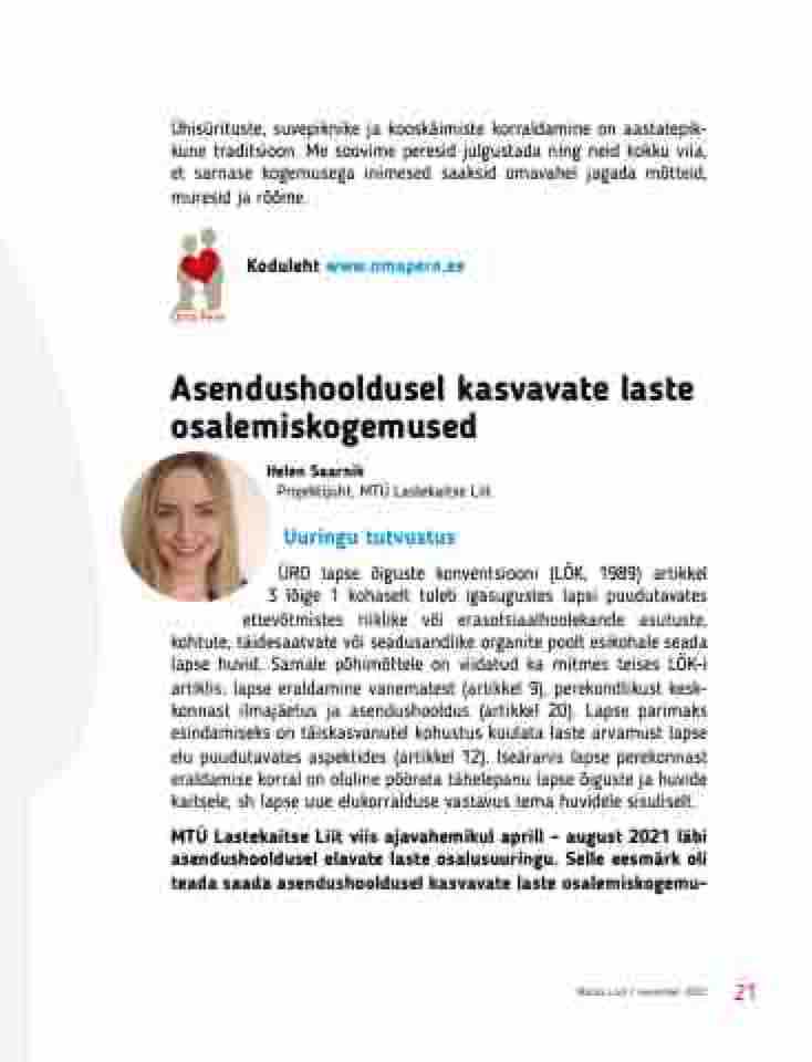 MTÜ Lastekaitse Liit viis ajavahemikul aprill – august 2021 läbi asendushooldusel elavate laste osalusuuringu. Selle eesmärk oli teada saada asendushooldusel kasvavate laste osalemiskogemu-