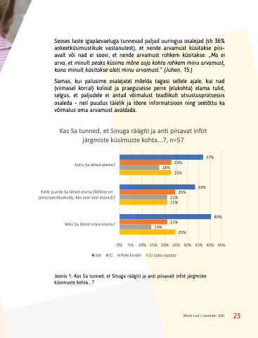 Seoses laste igapäevaeluga tunnevad paljud uuringus osalejad (sh 36% ankeetküsimustikule vastanutest), et nende arvamust küsitakse piis- avalt või nad ei soovi, et nende arvamust rohkem küsitakse: „Ma ei arva, et minult peaks küsima mõne asja kohta rohkem minu arvamust, kuna minult küsitakse alati minu arvamust.“ (Juhan, 15.)