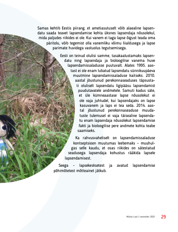 Samas kehtib Eestis piirang, et ametiasutuselt võib alaealine lapsen- datu saada teavet lapsendamise kohta üksnes lapsendaja nõusolekul, mida paljudes riikides ei ole. Kui vanem ei taga lapse õigust teada oma päritolu, võib tegemist olla vanemliku võimu liialdusega ja lapse