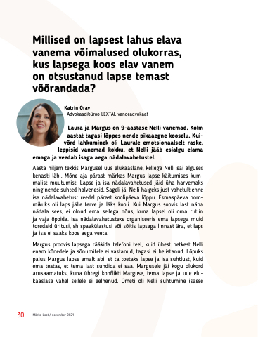 Laura ja Margus on 9-aastase Nelli vanemad. Kolm aastat tagasi lõppes nende pikaaegne kooselu. Kui- võrd lahkuminek oli Laurale emotsionaalselt raske, leppisid vanemad kokku, et Nelli jääb esialgu elama