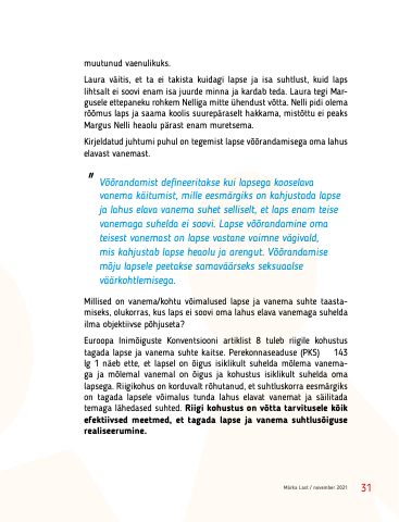 Laura väitis, et ta ei takista kuidagi lapse ja isa suhtlust, kuid laps lihtsalt ei soovi enam isa juurde minna ja kardab teda. Laura tegi Mar- gusele ettepaneku rohkem Nelliga mitte ühendust võtta. Nelli pidi olema rõõmus laps ja saama koolis suurepäraselt hakkama, mistõttu ei peaks Margus Nelli heaolu pärast enam muretsema.