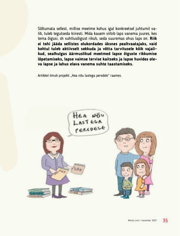 Sõltumata sellest, millise meetme kohus igal konkreetsel juhtumil va- lib, tuleb tegutseda kiiresti. Mida kauem viibib laps vanema juures, kes tema õigusi, sh suhtlusõigust rikub, seda suuremas ohus laps on. Riik ei tohi jääda sellistes olukordades üksnes pealtvaatajaks, vaid kohtul tuleb aktiivselt sekkuda ja võtta tarvitusele kõik vajali- kud, sealhulgas äärmuslikud meetmed lapse õiguste rikkumise lõpetamiseks, lapse vaimse tervise kaitseks ja lapse huvides ole- va lapse ja lahus elava vanema suhte taastamiseks.