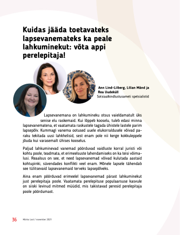 Lapsevanemana on lahkumineku otsus vaieldamatult üks senise elu raskemaid. Kui lõppeb kooselu, tuleb edasi minna lapsevanematena, et vaatamata raskustele tagada ühistele lastele parim lapsepõlv. Kummagi vanema ootused uuele elukorraldusele võivad pa- raku tekitada uusi lahkhelisid, sest enam pole nii kerge kokkuleppele
