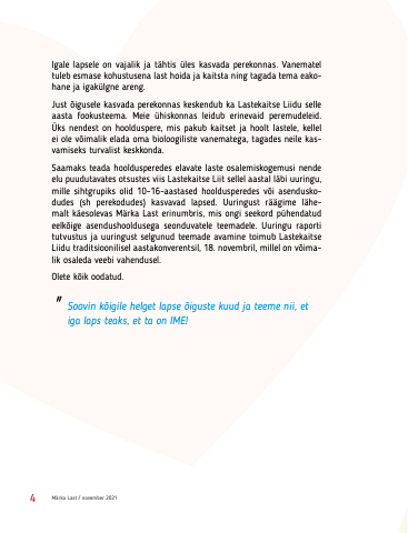 Saamaks teada hooldusperedes elavate laste osalemiskogemusi nende elu puudutavates otsustes viis Lastekaitse Liit sellel aastal läbi uuringu, mille sihtgrupiks olid 10–16-aastased hooldusperedes või asendusko- dudes (sh perekodudes) kasvavad lapsed. Uuringust räägime lähe- malt käesolevas Märka Last erinumbris, mis ongi seekord pühendatud eelkõige asendushooldusega seonduvatele teemadele. Uuringu raporti tutvustus ja uuringust selgunud teemade avamine toimub Lastekaitse Liidu traditsioonilisel aastakonverentsil, 18. novembril, millel on võima- lik osaleda veebi vahendusel.