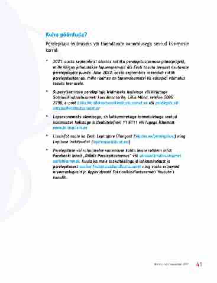 Perelepitaja leidmiseks või täiendavate vanemlusega seotud küsimuste korral: