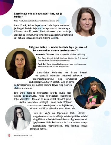 ja hingelt lastekaitsja on lastega seotud teemadega töötanud üle 12 aasta. Neist viimased kuus juhib ja arendab ta teenust, mis tegeleb seksuaalselt väärkoheldud või kohatu seksuaalse käitumisega lastega.