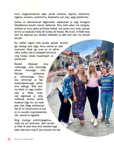 Samas on keerulisemad kogemused, väljakutsed ja isegi kunagine läbipõlemine kasuks tulnud, õpetanud. Tänu neile oskan ma märgata, millised on minu jaoks kriitilised hetked, mis aitab minu enda vaimset tervist ja tasakaalu hoida või kuidas abi küsida. Ma arvan, et kõike seda olen ma õppinud just nendest hetkedest ja selle eest olen ma ülimalt tänulik.