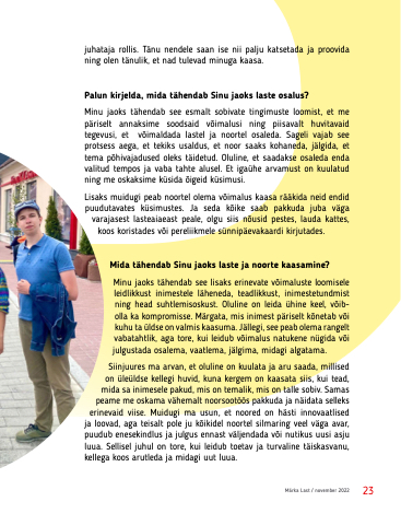 Lisaks muidugi peab noortel olema võimalus kaasa rääkida neid endid puudutavates küsimustes. Ja seda kõike saab pakkuda juba väga varajasest lasteaiaeast peale, olgu siis nõusid pestes, lauda kattes,