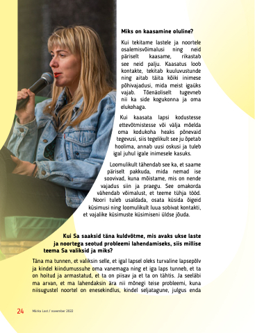 Kui tekitame lastele ja noortele osalemisvõimalusi ning neid päriselt kaasame, rikastab see neid palju. Kaasatus loob kontakte, tekitab kuuluvustunde ning aitab täita kõiki inimese põhivajadusi, mida meist igaüks vajab. Tõenäoliselt tugevneb nii ka side kogukonna ja oma elukohaga.