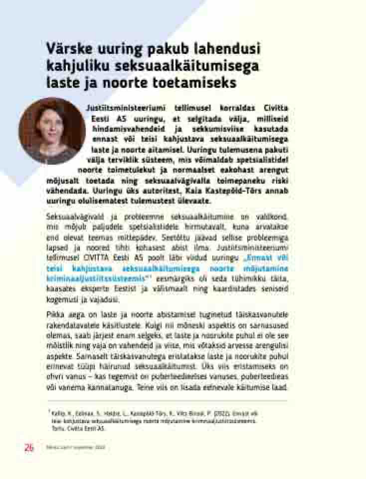 Justiitsministeeriumi tellimusel korraldas Civitta Eesti AS uuringu, et selgitada välja, milliseid hindamisvahendeid ja sekkumisviise kasutada ennast või teisi kahjustava seksuaalkäitumisega laste ja noorte aitamisel. Uuringu tulemusena pakuti välja terviklik süsteem, mis võimaldab spetsialistidel noorte toimetulekut ja normaalset eakohast arengut mõjusalt toetada ning seksuaalvägivalla toimepaneku riski vähendada. Uuringu üks autoritest, Kaia Kastepõld-Tõrs annab