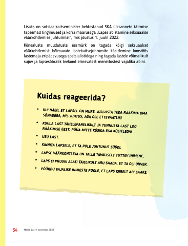Lisaks on sotsiaalkaitseminister kehtestanud SKA ülesannete täitmise täpsemad tingimused ja korra määrusega „Lapse abistamine seksuaalse väärkohtlemise juhtumitel“, mis jõustus 1. juulil 2022.