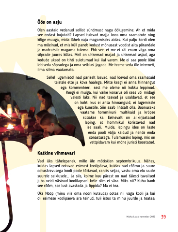 Sellel lugemisööl nad päriselt loevad, nad loevad oma raamatuid teistele ette ja kõva häälega. Mitte keegi ei anna hinnangut ega kommenteeri, sest me oleme nii kokku leppinud. Keegi ei muiga, kui väike konarus oli sees või midagi valesti läks. Nii nad teavad ja usaldavad, et see on koht, kus ei anta hinnanguid, ei lugemisele ega kunstile. Siin saab lihtsalt olla. Boonuseks vaatame hommikuni multikaid ja krõpse süüakse ka. Eelnevalt on allkirjastatud leping, et hommikul koristavad nad ise saali. Muide, lepingu idee on laste enda poolt välja käidud ja nende enda sõnastusega. Tulemuseks leping, mis on vettpidavam kui mõne juristi koostatud.