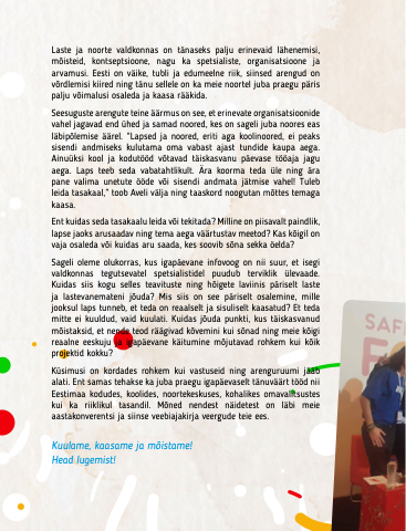 Küsimusi on kordades rohkem kui vastuseid ning arenguruumi jääb alati. Ent samas tehakse ka juba praegu igapäevaselt tänuväärt tööd nii Eestimaa kodudes, koolides, noortekeskuses, kohalikes omavalitsustes kui ka riiklikul tasandil. Mõned nendest näidetest on läbi meie aastakonverentsi ja siinse veebiajakirja veergude teie ees.