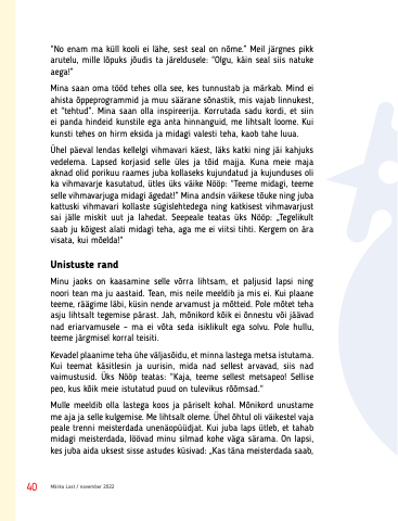 Mina saan oma tööd tehes olla see, kes tunnustab ja märkab. Mind ei ahista õppeprogrammid ja muu säärane sõnastik, mis vajab linnukest, et “tehtud”. Mina saan olla inspireerija. Korrutada sadu kordi, et siin ei panda hindeid kunstile ega anta hinnanguid, me lihtsalt loome. Kui kunsti tehes on hirm eksida ja midagi valesti teha, kaob tahe luua.