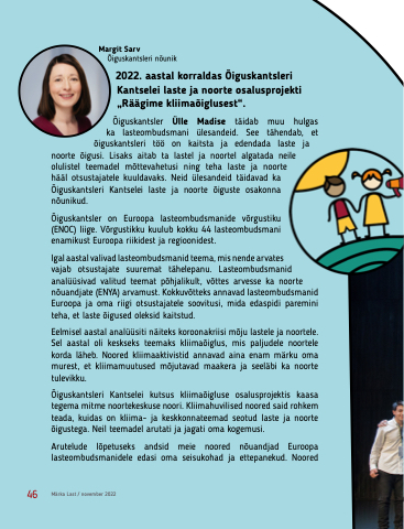 2022. aastal korraldas Õiguskantsleri Kantselei laste ja noorte osalusprojekti „Räägime kliimaõiglusest“.