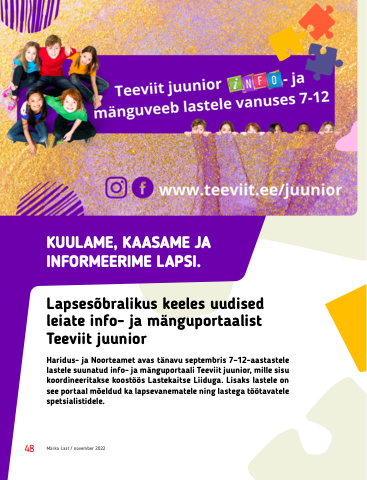Haridus- ja Noorteamet avas tänavu septembris 7–12-aastastele lastele suunatud info- ja mänguportaali Teeviit juunior, mille sisu koordineeritakse koostöös Lastekaitse Liiduga. Lisaks lastele on see portaal mõeldud ka lapsevanematele ning lastega töötavatele spetsialistidele.