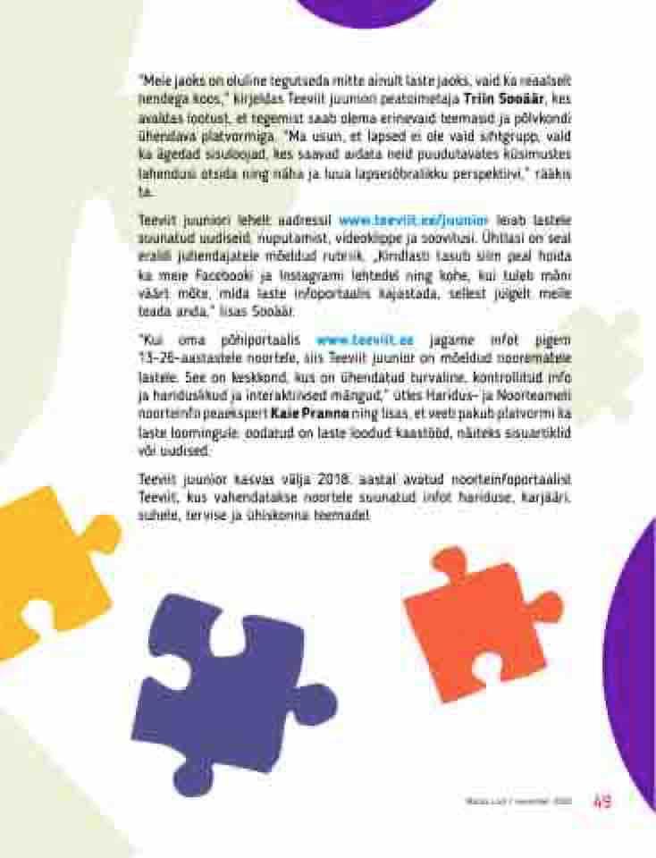 Teeviit juuniori lehelt aadressil www.teeviit.ee/juunior leiab lastele suunatud uudiseid, nuputamist, videoklippe ja soovitusi. Ühtlasi on seal eraldi juhendajatele mõeldud rubriik. „Kindlasti tasub silm peal hoida ka meie Facebooki ja Instagrami lehtedel ning kohe, kui tuleb mõni väärt mõte, mida laste infoportaalis kajastada, sellest julgelt meile teada anda,“ lisas Sooäär.