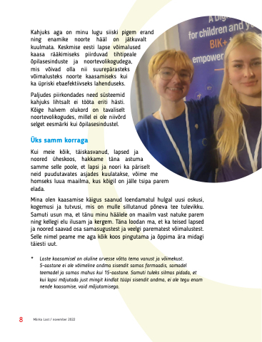 Mina olen kaasamise käigus saanud loendamatul hulgal uusi oskusi, kogemusi ja tutvusi, mis on mulle sillutanud põneva tee tulevikku. Samuti usun ma, et tänu minu häälele on maailm vast natuke parem ning kellegi elu ilusam ja kergem. Täna loodan ma, et ka teised lapsed ja noored saavad osa samasugustest ja veelgi parematest võimalustest. Selle nimel peame me aga kõik koos pingutama ja õppima ära midagi täiesti uut.