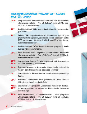 2010 Programm võeti piloteerimiseks kasutusele Eesti lasteaedades „Kiusamisest vabaks! – Free of Bullying” nime all MTÜ Las- tekaitse Liit eestvedamisel.