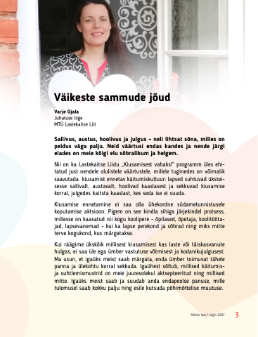 Nii on ka Lastekaitse Liidu „Kiusamisest vabaks!“ programm üles ehi- tatud just nendele olulistele väärtustele, millele tuginedes on võimalik saavutada kiusamist ennetav käitumiskultuur: lapsed suhtuvad ükstei- sesse sallivalt, austavalt, hoolivad kaaslasest ja sekkuvad kiusamise korral, julgedes kaitsta kaaslast, kes seda ise ei suuda.