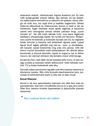 ootamatuid olukordi, mõistmatusest tingitud kiuslemist jms. Ka neist tuleb lastegruppidele sobivalt rääkida, olgu teemaks siis kas diabeet, mis eeldab pidevat kontrollimist ja sekkumisi või epilepsia, astma, aller- gia või miski muu, mis vajab kiiret ja teadlikku reageerimist. Sellised olukorrad põhjustavad ka täiskasvanutes ärevust ja lastel ei jää see märkamata. Sageli tõrjutakse teised lapsed selgituste ja kaasamise asemel neist toimingutest eemale, tehakse juhtuvast mingi „suurte inimeste asi“. See võib lastes tekitada trotsi, tuua kaasa negatiivset tähelepanu abivajadusega lapsele, kes tunneb end tõrjutuna. Ühiskon- nana saame me hoolivaks ja märkavaks kasvada vaid siis, kui selgitame lastele toimuvat ja kaasame neid jõukohaselt algusest peale. Lapsed õpivad kiirelt selgeks põhitõed ning neid ea-, soovi- ja võimetekoha- selt kaasates saavad koostoimida ning anda oma panuse, mille läbi toimuv muutub loomulikuks osaks lasteaiapäevast. Nii väheneb põhjus kiusamiseks ja tõrjutud olemiseks. Lapsed on targad ja nad on tõeline ressurss, kes väärivad võimalust olla kontaktis ennast ümbritsevaga.