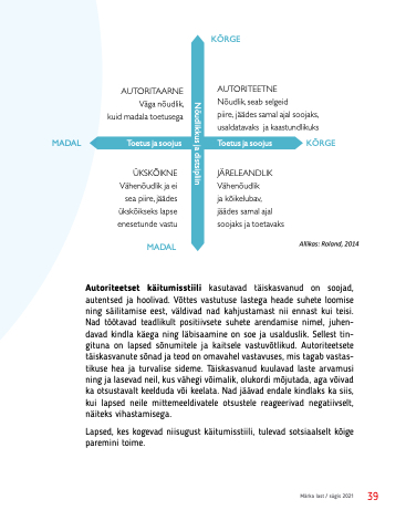 Autoriteetset käitumisstiili kasutavad täiskasvanud on soojad, 33 autentsed ja hoolivad. Võttes vastutuse lastega heade suhete loomise ning säilitamise eest, väldivad nad kahjustamast nii ennast kui teisi. Nad töötavad teadlikult positiivsete suhete arendamise nimel, juhen- davad kindla käega ning läbisaamine on soe ja usalduslik. Sellest tin- gituna on lapsed sõnumitele ja kaitsele vastuvõtlikud. Autoriteetsete täiskasvanute sõnad ja teod on omavahel vastavuses, mis tagab vastas- tikuse hea ja turvalise sideme. Täiskasvanud kuulavad laste arvamusi ning ja lasevad neil, kus vähegi võimalik, olukordi mõjutada, aga võivad