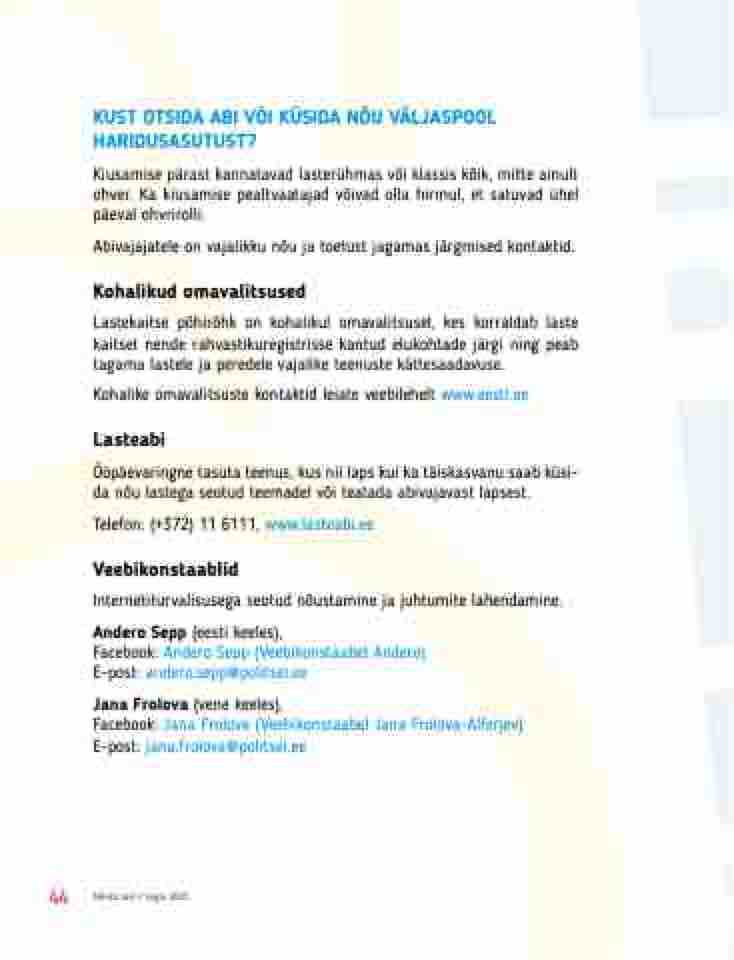 Kohalike omavalitsuste kontaktid leiate veebilehelt www.eesti.ee Lasteabi