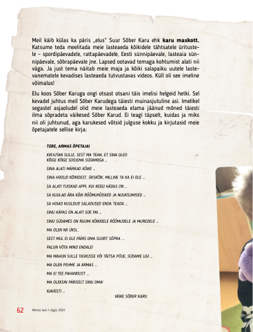 Meil käib külas ka päris „elus“ Suur Sõber Karu ehk karu maskott. Katsume teda meelitada meie lasteaeda kõikidele tähtsatele ürituste- le – spordipäevadele, rattapäevadele, Eesti sünnipäevale, lasteaia sün- nipäevale, sõbrapäevale jne. Lapsed ootavad temaga kohtumist alati nii väga. Ja just tema näitab meie maja ja kõiki salapaiku uutele laste- vanematele kevadises lasteaeda tutvustavas videos. Küll oli see imeline võimalus!