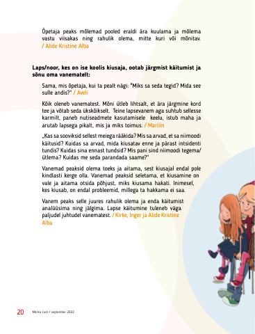 Õpetaja peaks mōlemad pooled eraldi ära kuulama ja mõlema vastu viisakas ning rahulik olema, mitte kuri või mōnitav. / Alide Kristine Alba