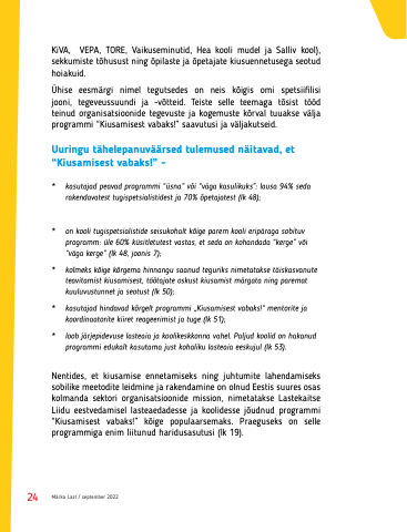 * kasutajad hindavad kõrgelt programmi „Kiusamisest vabaks!“ mentorite ja koordinaatorite kiiret reageerimist ja tuge (lk 51);