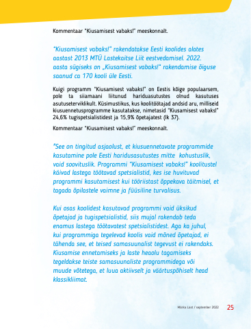 Kuigi programm “Kiusamisest vabaks!” on Eestis kõige populaarsem, pole ta siiamaani liitunud hariduasutustes olnud kasutuses asutuseterviklikult. Küsimustikus, kus koolitöötajad andsid aru, milliseid kiusuennetusprogramme kasutatakse, nimetasid “Kiusamisest vabaks!” 24,6% tugispetsialistidest ja 15,9% õpetajatest (lk 37).