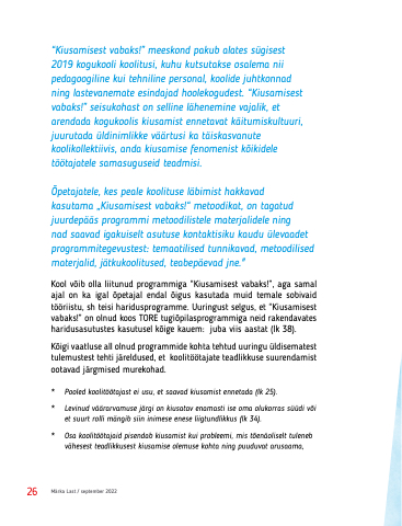 Kool võib olla liitunud programmiga “Kiusamisest vabaks!”, aga samal ajal on ka igal õpetajal endal õigus kasutada muid temale sobivaid tööriistu, sh teisi haridusprogramme. Uuringust selgus, et “Kiusamisest vabaks!” on olnud koos TORE tugiõpilasprogrammiga neid rakendavates haridusasutustes kasutusel kõige kauem: juba viis aastat (lk 38).