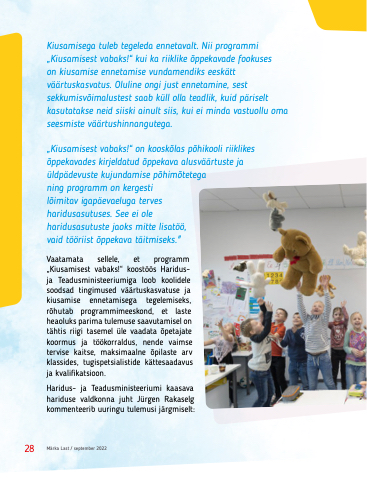 lõimitav igapäevaeluga terves haridusasutuses. See ei ole haridusasutuste jaoks mitte lisatöö, vaid tööriist õppekava täitmiseks."