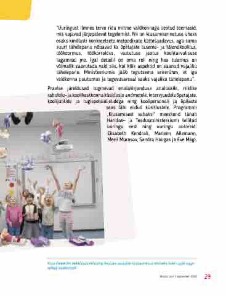 seas läbi viidud küsitlustele. Programmi „Kiusamisest vabaks!“ meeskond tänab Haridus- ja Teadusministeeriumi tellitud uuringu eest ning uuringu autoreid: Elisabeth Kendrali, Marleen Allemann, Meeli Murasov, Sandra Haugas ja Eve Mägi.