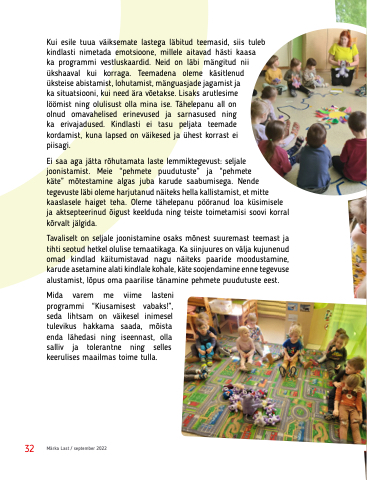 Mida varem me viime lasteni programmi “Kiusamisest vabaks!”, seda lihtsam on väikesel inimesel tulevikus hakkama saada, mõista enda lähedasi ning iseennast, olla salliv ja tolerantne ning selles keerulises maailmas toime tulla.