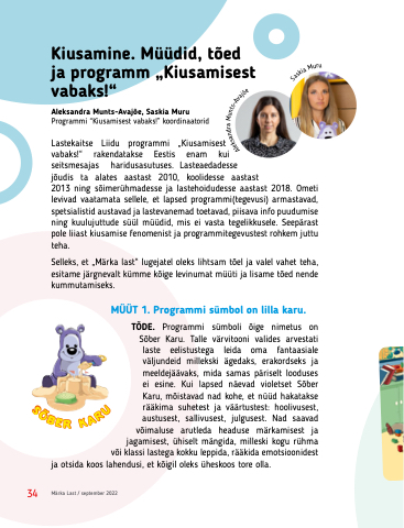 2013 ning sõimerühmadesse ja lastehoidudesse aastast 2018. Ometi levivad vaatamata sellele, et lapsed programmi(tegevusi) armastavad, spetsialistid austavad ja lastevanemad toetavad, piisava info puudumise ning kuulujuttude süül müüdid, mis ei vasta tegelikkusele. Seepärast pole liiast kiusamise fenomenist ja programmitegevustest rohkem juttu teha.