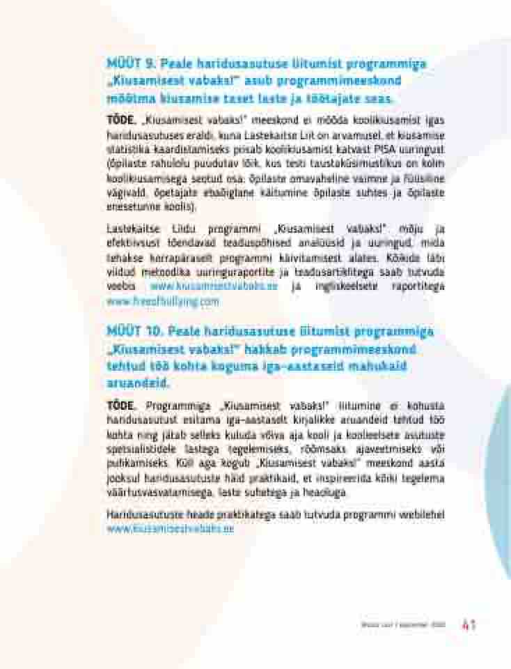 TÕDE. Programmiga „Kiusamisest vabaks!“ liitumine ei kohusta haridusasutust esitama iga-aastaselt kirjalikke aruandeid tehtud töö kohta ning jätab selleks kuluda võiva aja kooli ja koolieelsete asutuste spetsialistidele lastega tegelemiseks, rõõmsaks ajaveetmiseks või puhkamiseks. Küll aga kogub „Kiusamisest vabaks!“ meeskond aasta jooksul haridusasutuste häid praktikaid, et inspireerida kõiki tegelema väärtusvasvatamisega, laste suhetega ja heaoluga.