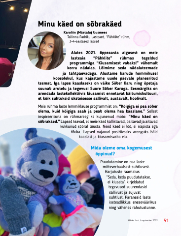 Alates 2021. õppeaasta algusest on meie lasteaia “Pähklite” rühmas tegeldud programmiga “Kiusamisest vabaks!” vähemalt korra nädalas. Lõimime seda nädalateemade ja tähtpäevadega. Alustame karude hommikusel koosolekul, kus kajastame uuele päevale planeeritud teemat. Iga lapse kaaslaseks on väike Sõber Karu ning õpetaja suunab arutelu ja tegevusi Suure Sõber Karuga. Eesmärgiks on arendada lastekollektiivis kiusamist ennetavat käitumiskultuuri,