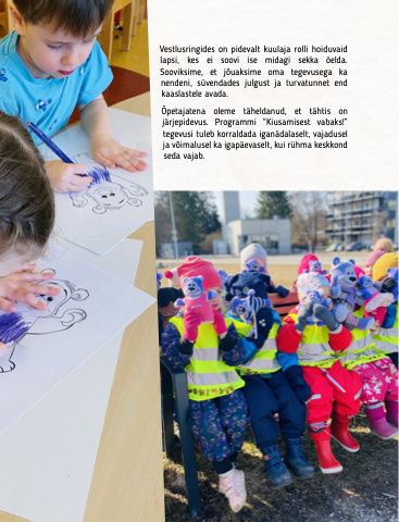 Õpetajatena oleme täheldanud, et tähtis on järjepidevus. Programmi “Kiusamisest vabaks!” tegevusi tuleb korraldada iganädalaselt, vajadusel ja võimalusel ka igapäevaselt, kui rühma keskkond