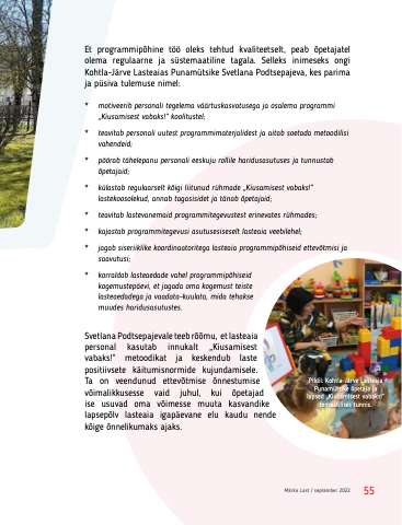 Et programmipõhine töö oleks tehtud kvaliteetselt, peab õpetajatel olema regulaarne ja süstemaatiline tagala. Selleks inimeseks ongi Kohtla-Järve Lasteaias Punamütsike Svetlana Podtsepajeva, kes parima ja püsiva tulemuse nimel: