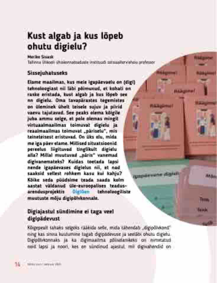 alla? Millal muutuvad „päris“ vanemad digivanemateks? Kuidas toetada lapsi nende igapäevases digielus nii, et nad saaksid sellest rohkem kasu kui kahju? Kõike seda püüdsime teada saada kolm aastat väldanud üle-euroopalises teadus- arendusprojektis DigiGen tehnoloogiliste muutuste mõju digipõlvkonnale.