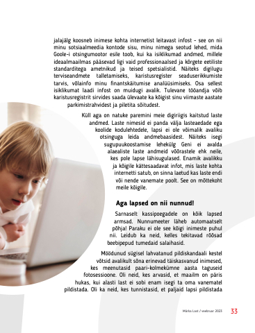 Küll aga on natuke paremini meie digiriigis kaitstud laste andmed. Laste nimesid ei panda välja lasteaedade ega koolide kodulehtedele, lapsi ei ole võimalik avaliku otsinguga leida andmebaasidest. Näiteks isegi sugupuukoostamise lehekülg Geni ei avalda alaealiste laste andmeid võõrastele ehk neile, kes pole lapse lähisugulased. Enamik avalikku ja kõigile kättesaadavat infot, mis laste kohta internetti satub, on sinna laetud kas laste endi või nende vanemate poolt. See on mõttekoht